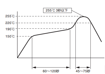 在下圖的端子溫度曲線范圍內(nèi),進(jìn)行回流焊接。有些回流焊接的裝置峰值很高,因此請務(wù)必預(yù)先進(jìn)行確認(rèn)試驗(yàn)