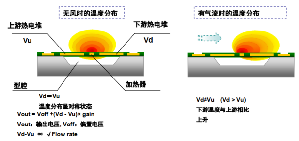 通過(guò)給MEMS芯片加恒定電流,使芯片中央的加熱器產(chǎn)生熱量。沒(méi)有風(fēng)通過(guò)時(shí),加熱器上游熱電堆和下游熱電堆由于熱平衡的關(guān)系,兩者對(duì)應(yīng)的熱電動(dòng)勢(shì)電壓相等,即Vu=Vd。當(dāng)有氣體流動(dòng)時(shí),熱源隨氣流方向向下游轉(zhuǎn)移,此時(shí)下游熱電堆的電動(dòng)勢(shì)變大,即Vd> Vu。兩個(gè)熱電堆的輸出差大致與通過(guò)傳感器表面的氣體質(zhì)量流量的平方根成正比。輸出靈敏度和質(zhì)量流量取決于氣體的組成比。微小的信號(hào)可以通過(guò)放大電路進(jìn)行放大,再以電子方式檢測(cè)氣體流量。風(fēng)量傳感器經(jīng)調(diào)整后輸出的電壓與質(zhì)量流量為 25°C、 101.3kPa 時(shí)的流速相當(dāng)。