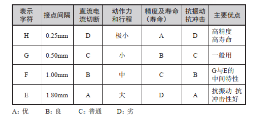 不同的接點(diǎn)間隔,開關(guān)行程的移動(dòng)差(即MD:從驅(qū)動(dòng)桿的動(dòng)作位置到復(fù)位位置的移動(dòng)距離或者移動(dòng)角度)、靈敏度、壽命、直流電流切斷、抗沖擊、抗振動(dòng)的能力都不同。